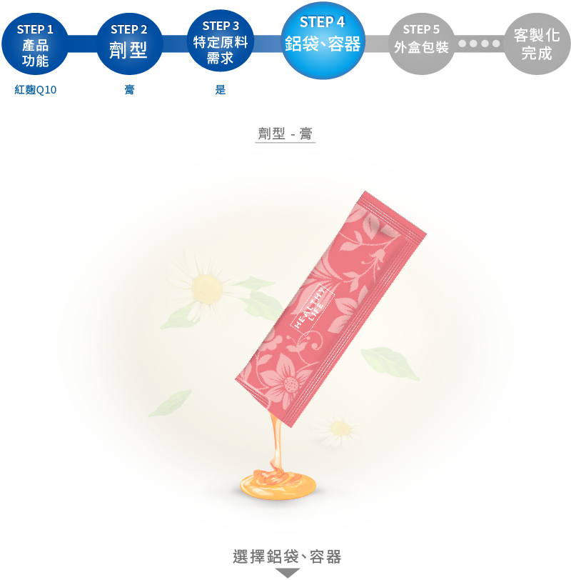 針對不同劑型皆有不同款式的鋁袋可供挑選,每款皆不同顏色可以選擇,無需等待1個月以上的鋁捲製作時間,可搭配配方小量訂購,快速出貨!