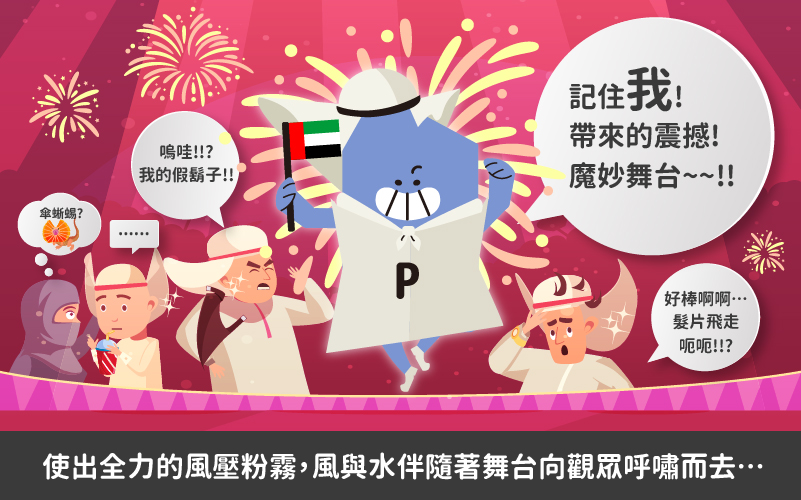 《首站-解救杜拜掉髮危機!》 Wel.Powdy為風舞秀製造出非常美麗的開場。觀眾比預期的更加熱情,表演歡呼越來越大聲, Wel.Powdy為了回應這份呼喊,使出全力的風壓粉霧,風與水伴隨著舞台向觀眾呼嘯而去….然而…. 粉包闖禍後...