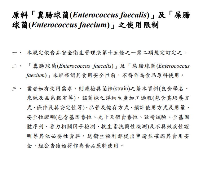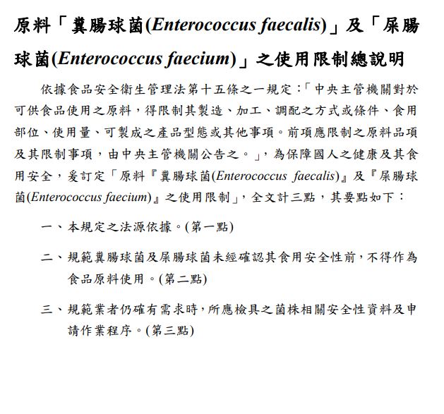 「原料『糞腸球菌(Enterococcus faecalis)』及『屎腸球菌(Enterococcus faecium)』之使用限制」,108年7月1日生效
