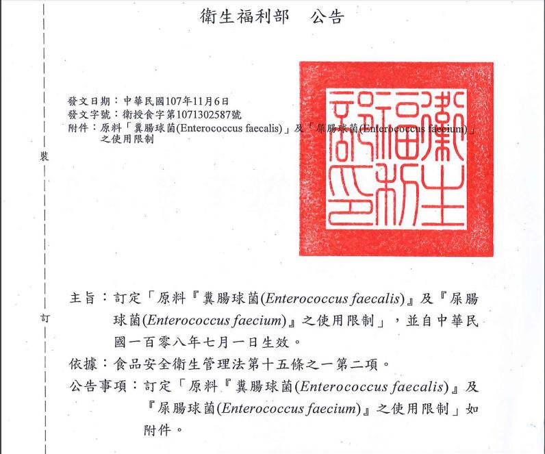 「原料『糞腸球菌(Enterococcus faecalis)』及『屎腸球菌(Enterococcus faecium)』之使用限制」,108年7月1日生效