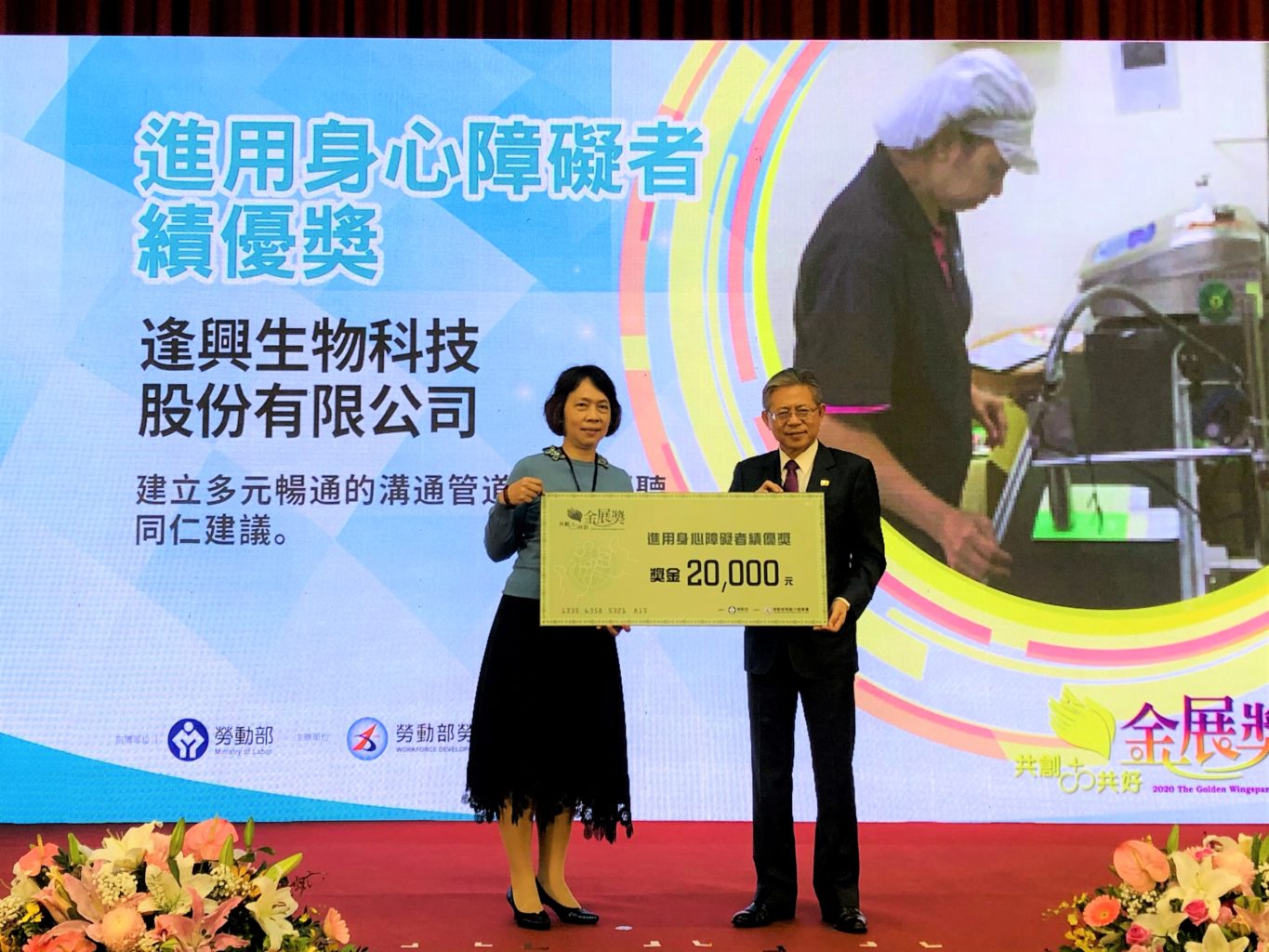 2020年第18屆金展獎「共創X共好」日前在臺大醫院國際會議中心舉辦頒獎典禮,逢興生技長年來進用身心障礙者,為身心障礙者打造友善環境,而身心障礙者進入職場後表現良好,幫助公司成長,也讓身心障礙者投入職場分擔家計減輕負擔,創造雙贏的局面,榮幸獲得「進用身心障礙者績優單位–二等獎」的肯定。