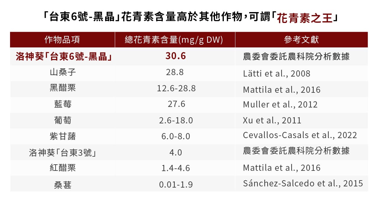 台東農改場歷時9年育成新品種洛神葵「台東6號-黑晶」,花青素含量是現行市售品種台東3號的7.7倍,比山桑子、黑醋栗、藍莓還高,封為「花青素之王」當之無愧。根據中山醫學大學研究,洛神葵中的花青素具有抗氧化、美肌、抗發炎、預防心血管病變及抗血癌、大腸癌等功效,在降血脂上也有很強的作用,因此很多人會泡洛神葵飲用,除了富含花青素外,洛神葵因含有類黃酮與多酚等機能性成分而廣被作為保健飲食。