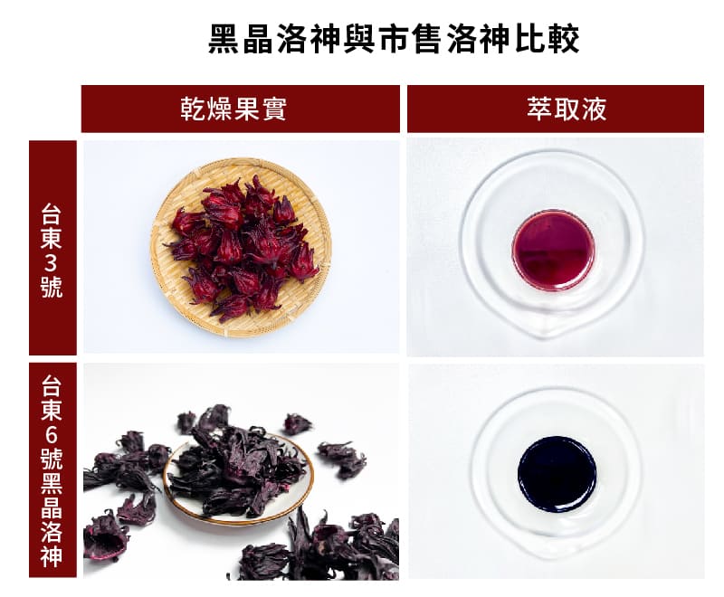 為了提高洛神葵中的花青素,台東農改場以果萼富含花青素的品系為母本,植株挺拔、果萼排列緊密之品系為父本進行雜交,後代分離選拔採混合法,由第8個世代選拔及固定目標性狀,歷時9年栽培出「黑晶洛神」。黑晶洛神花青素含量為市售品種的7.7倍,與市售洛神葵玫瑰紅不同,呈現高雅內斂的深紫色,是高品質、效性成分含量更高的新品種。