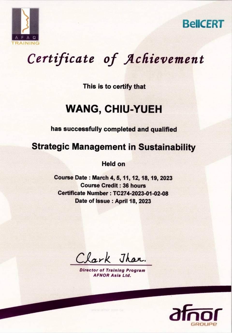 在這份堅定承諾的背後,王秋月董事長參與由MISA智享會與永續國際合辦的ESG國際領袖班,做為自己學習ESG策略管理的第一步!在經歷精鍊實戰課程,深入探討了ESG管理策略的實踐和實踐者的角色,最終通過考試,取得在國際間具有百年歷史且頗負盛名的的ESG國際領袖班所頒發的永續策略管理師國際證照。這是對逢興生技領導人在企業永續發展的承諾和決心的肯定,更表明了公司對環境友善議題的關注和堅持。未來,逢興生技將致力於推動環境友善議題,落實企業社會責任,並發展更多元化的永續商模。