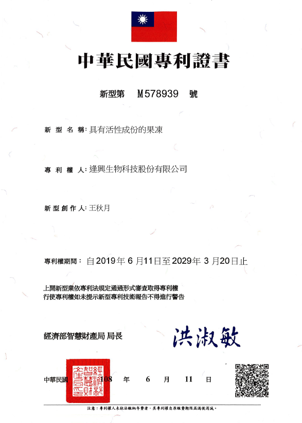 逢興生技持續推動保健食品食品化,用好吃且方便的產品來提升民眾對於保健食品的接受度,但在功效上絕不打折扣,專利的取得說明了FRESH-Jelly®新凍確保了美味之於,產品能有效的將活性成分保存,讓人體快速吸收利用,給民眾最健康且有效又美味保健食品。