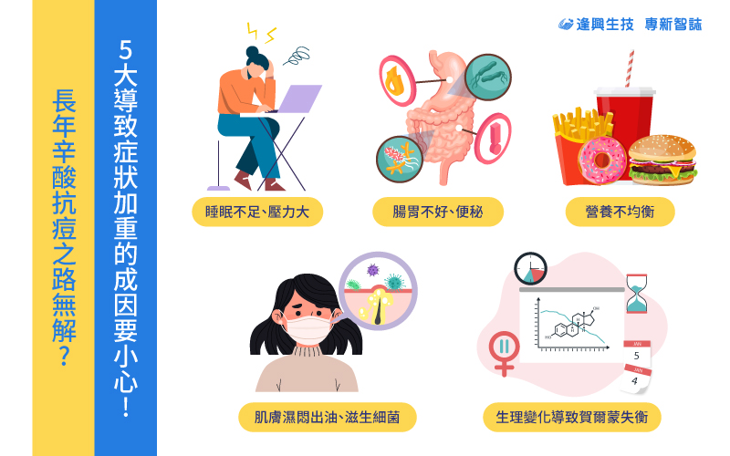 對於痘痘肌患者來說,抗痘之路漫長艱辛,痘痘纏身的困擾常常持續多年,期間嘗試各種抗痘產品與偏方,痘痘卻還是野火燒不盡,春風吹又生,結果只能默默承受外貌帶來的心理壓力。而痘痘雖然是呈現在表面的症狀,實際上卻跟身體是否健康脫離不了關係。[5]痘痘最直接的成因是皮脂分泌旺盛,造成毛孔堵塞、紅腫發炎,而我們生活中有需多因素會導致體內失衡、皮膚冒痘,例如: