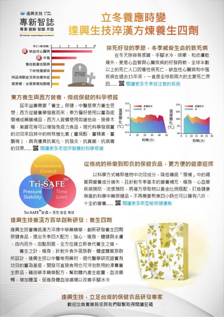 逢興生技薈傳統漢方淬煉中草藥精華,創新研發養生四劑保健食品,推出冬季四大配方:強心、暖身、體健與水膚,由內而外,由點到面,全方位建立新食代養生之道。