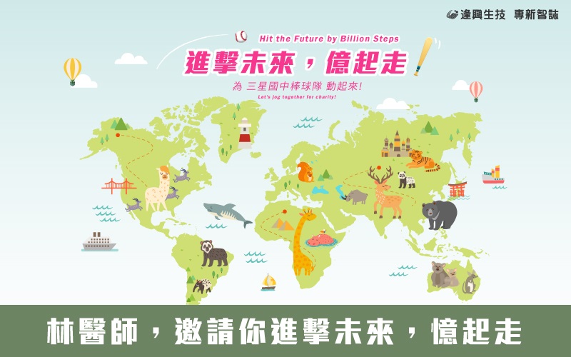 也許對於跑步與登山的熱愛不是每個人都擁有,但適當的「踏踏步」可以活絡經骨,只有益而無害,就像這次逢興生技發起的公益活動「進擊未來,億起走!」我很享受與家人一起運動出遊的時光,我相信這個app的互動程式一定激起了許多人的勝負欲,不停查看自己的排名,深怕落人之後。簡單的遊戲,透過一點點的改變,讓自己更健康,同時也做公益,我們捐贈步數,逢興生技則提供專業的保健食品營養補充與經費贊助,讓三星國中的棒球隊小朋友在賣力練習成為下一個球壇巨星時能無健康與經費的後顧之憂,一舉兩得。不要讓病痛成為阻擋你健康的理由。說沒有難受是不可能的,但我很高興我擁有專業的知識與復健的決心讓我可以輕易做改變,我相信每個人都可以改變,從踏出第一步開始。