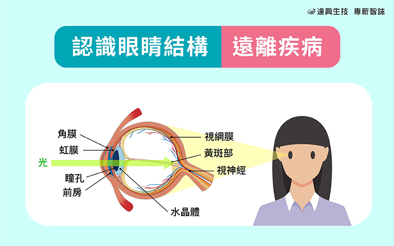 要解釋這些病症,必須解構眼睛:光線從外進來時必須聚焦在視網膜上才能顯影,就如同相機投影在底片上,如果光線聚焦在視網膜前方就是近視,後方就變成遠視,黃斑部是視網膜的中央部分,為感光細胞聚集之處,掌管視覺的敏感度與清晰度,當眼睛轉動去注視一個地方時,眼睛的結構會讓光線聚焦在這個區域。