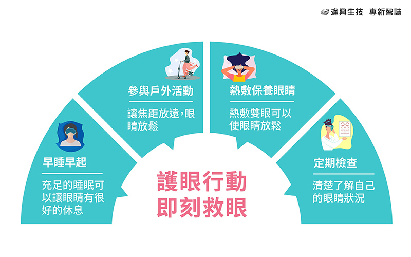 要避免眼睛受傷、年未老視先衰,非常需要注意自己的閱讀習慣與平常使用3C產品的狀態:首先,避免在晃動的環境下,例如搭乘車輛看韓劇;或是在黑暗中,例如半夜睡前關燈滑手機。最好是在光線充足環境下,並且每30分鐘要休息10分鐘。除此之外更可以多做一些基本的護眼行動,例如: