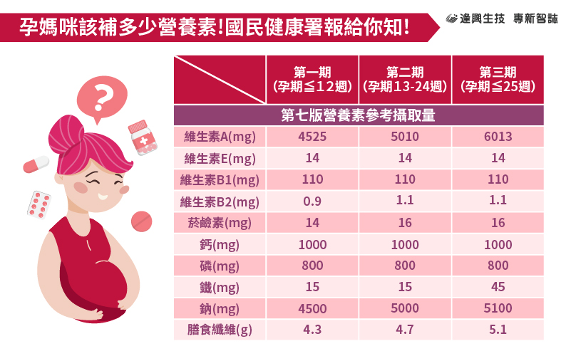 孕期間母親要承受許多生理上的不適,又必須更加注意生活習慣和飲食攝取以確保胎兒健康,國民健康署針對不同孕期孕婦的營養素缺乏率和維生素A、維生素E、維生素B1及B2、菸鹼素、鈣、磷、鐵、鈉及膳食纖維攝取量提供了詳細的建議,營養補充是在孕期不可忽略的一環。