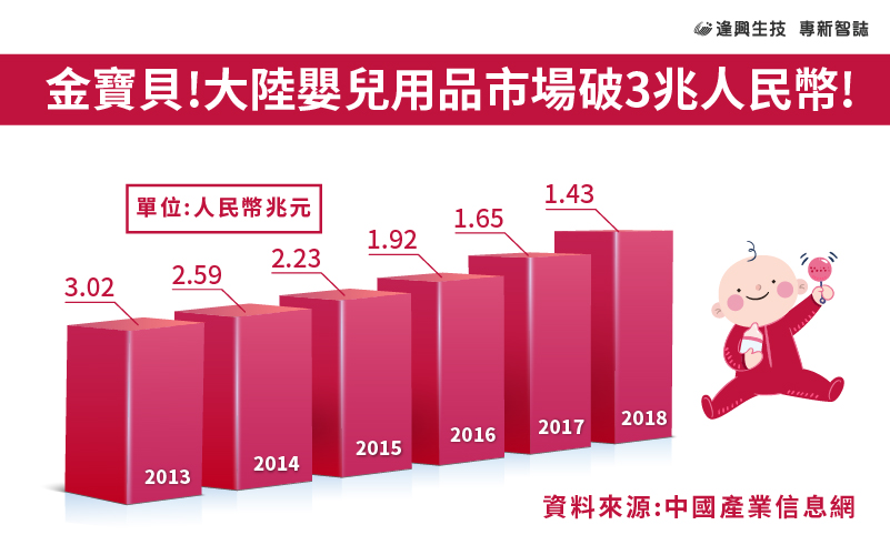 而根據中國產業訊息網在2019公布的調查資料,中國的母嬰市場逐年成長,在2018年突破了3兆人民幣的大關。