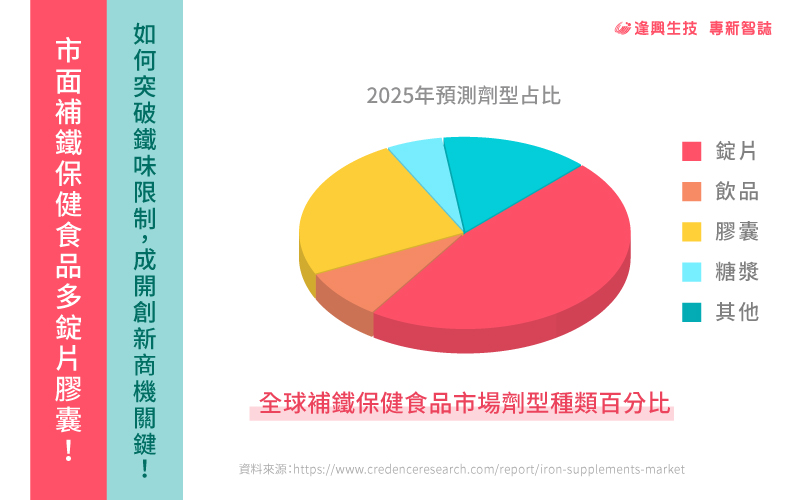 雖然補鐵保健食品市場逐漸成長,但市面上的補鐵保健食品,劑型並不多元,依然選擇使用膠囊、錠片的廠商較多數,包含知名保健食品廠商,例如,萊萃美 Nature Made補鐵錠片;白蘭氏推出鐵加維生素的複方錠片;在日本討論度高的DHC則是推出,搭配維生素B12、葉酸的補鐵膠囊,而劑型較單一,主要是因為添加的鐵劑有金屬味,味道不佳,所以較少運用偏向食品的友善劑型。