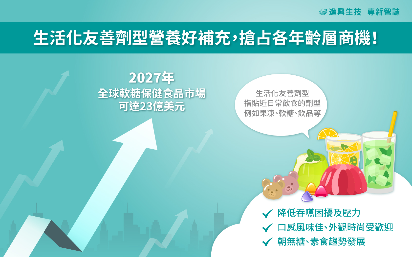 生活化友善劑型的研發技術是否成熟,更影響消費者吃的保健食品是否真的優質且有效。在產業的變遷下,民眾對於軟糖、果凍等保健食品的依賴將會越來越高,也會讓更多原本抗拒保健食品的人開始養成吃保健食品的習慣,品牌越早投入友善劑型越能提前抓住這塊擴張中的商機。