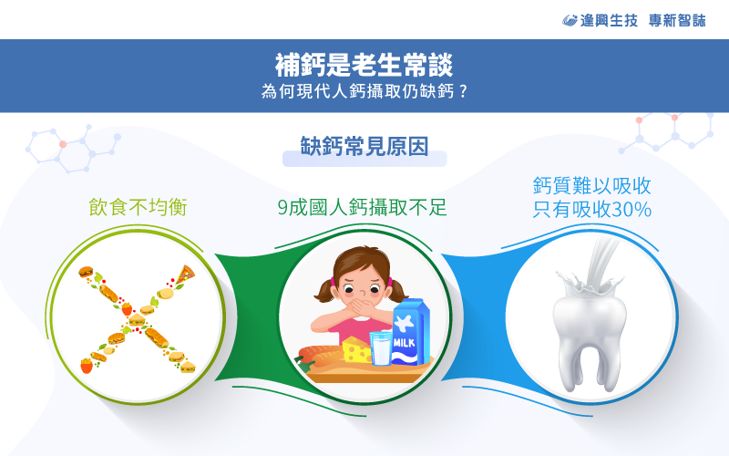 古今中外都知道補鈣的必須性,《本草綱目》所述:久服芝麻可以明眼、身輕、不老。芝麻具有豐富的鈣,早在數百年前就已得到中醫的肯定,鈣質不足者,可在飲用牛奶時加入一匙黑芝麻,加強鈣質吸收的效果。西方一直以來都崇尚日光浴,飲食以高鈣食物為主,鈣的補充來源多,因此體質與骨骼,都比東方人更為健壯,但由於鈣的吸收率不高,過了青壯年時期,西方人還是常見骨骼疏鬆的困擾。 現代人的飲食習慣不均衡,補鈣成為自古至今重視的保健議題,缺鈣容易影響全身的機能,進而產生疲憊感,像是停經婦女缺乏荷爾蒙,腸道吸收鈣質能力變差,睡眠品質也隨之受到影響,缺鈣的問題可以說是牽一髮而動全身,甚至容易伴隨著抽筋、皮膚粗糙、視力模糊、蛀牙等負面影響,因此小問題也別輕忽,有可能是缺鈣所導致。 由於鈣的吸收率低,單透過進食無法有效補充,再加上民眾沒有養成定時服用相關保健食品的習慣,從研究顯示,有九成的民眾鈣質攝取不足,其中正處發育補鈣關鍵期的兒童、面臨骨骼疏鬆問題的更年期婦女與中老年人、以及為了寶寶骨骼發展而補充營養的孕婦,都可以視為補鈣市場供需的三大主力軍[1] ,全球鈣補充劑市場預計到2032 年收入將達80.1億美元,目前預估亞太地區將成為最大的市場,歐洲則位居第二[2][3][4] ,可見補鈣的保健需求與日俱增。