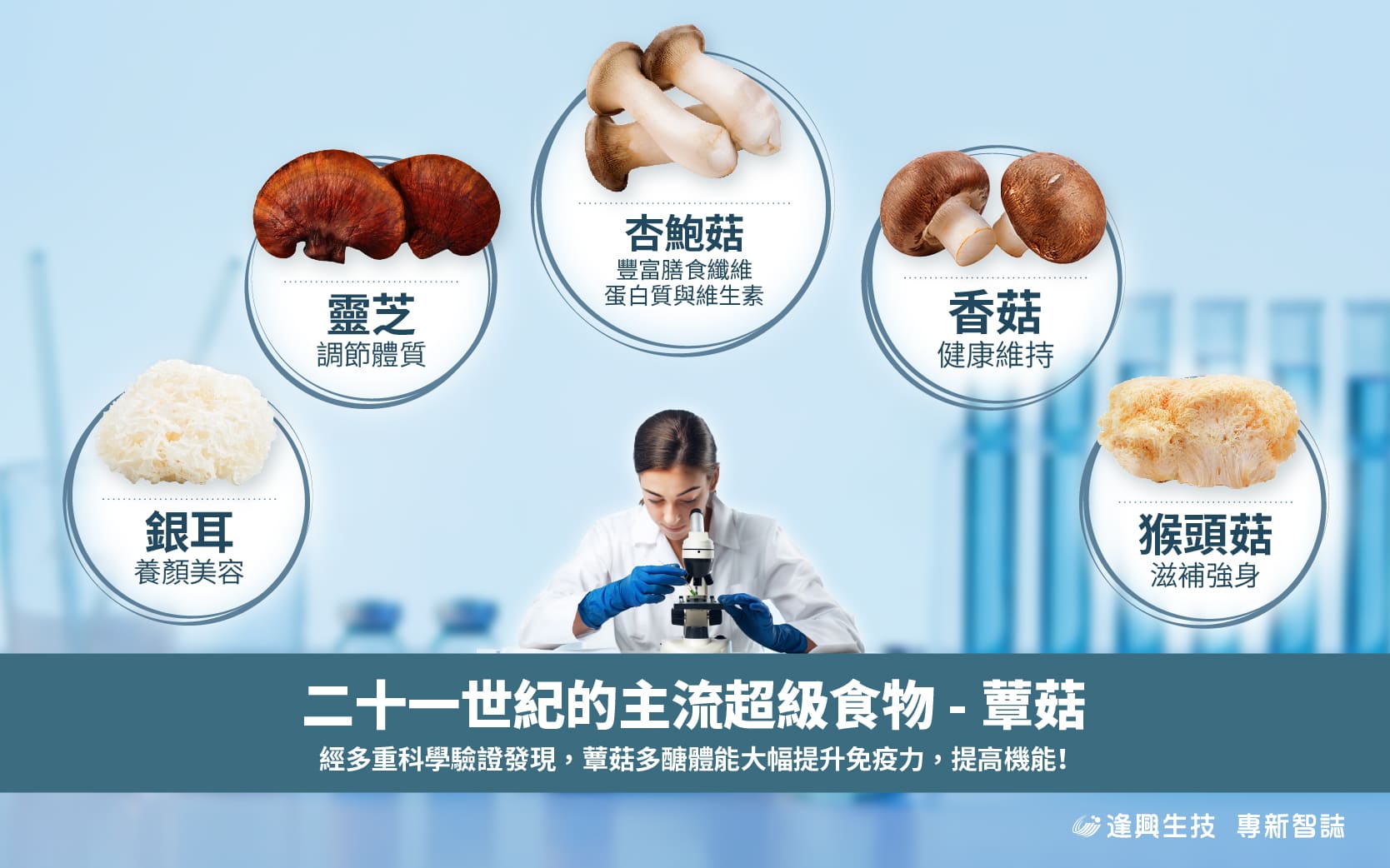 蕈菇類在食補界一直擁有居高不下的地位,因為它們富含多醣體以及人體必需胺基酸、蛋白質、礦物質、豐富的維生素B群與維生素D[1],因此在東方,這類的珍貴藥材,從古代就被認定為中藥養生保健的極品。在近代,更出現許多相關研究,紛紛指出蕈菇類對身體帶來的多重正向效益,而在西方醫學界也引起廣泛的討論[2],其中最受注目的物質,就是蕈菇類中的多醣體,主要多來自四種菇類:靈芝(調節體質)、銀耳(養顏美容)、香菇(健康維持)、猴頭菇(滋補強身)[3],其擁有高活性與高安定性,以及卓越的三大應用功效:增強體力、調整體質、幫助維持消化道機能[4],因此常被製成保健產品。