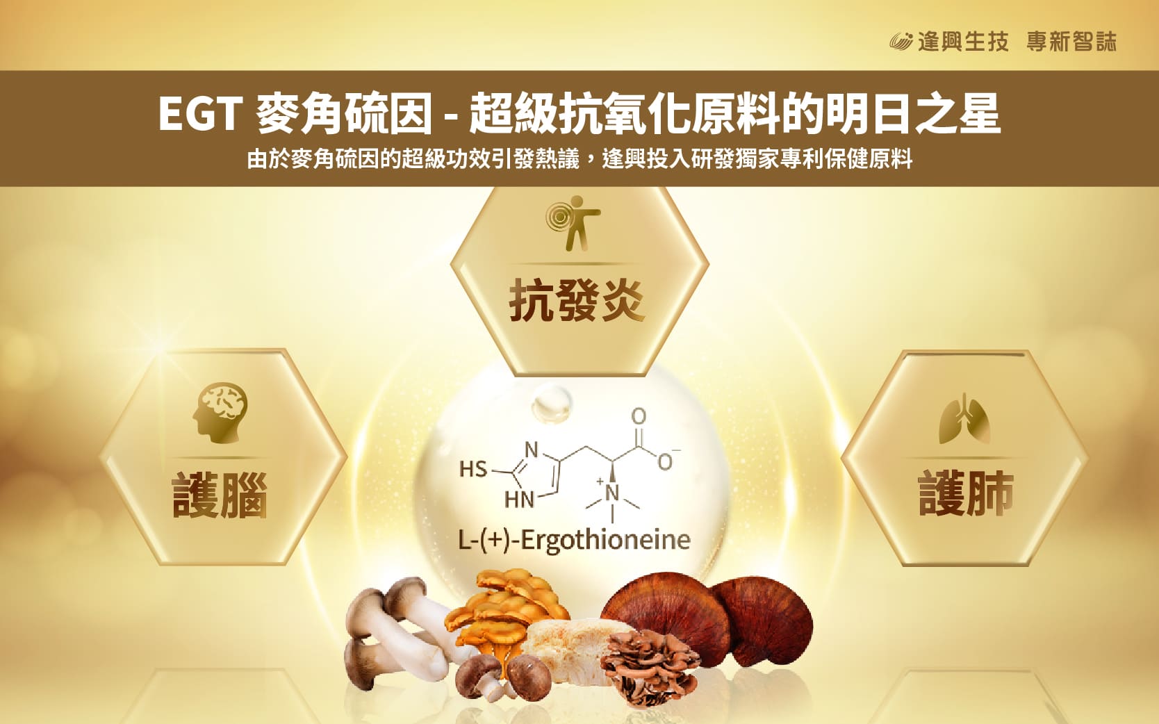 麥角硫因有抗發炎、護腦、護肺的功效,能降低發炎因子對細胞的傷害,有效保護血腦障壁,也能增加腦神經中微管蛋白的數量,協助訊息傳導,並抑制肺部嗜中性球的發炎以減緩肺部受損。麥角硫因本身自帶超級抗氧化力,在醫療、食品、化妝品[13]的應用上都有卓越的效益。根據MarketWatch統計,2021年全球麥角硫因市場規模為1502萬美元,預測2028年市場規模將達到9305萬美元[14],由於麥角硫因的超級功效引發熱議,逢興投入研發獨家專利保健原料。