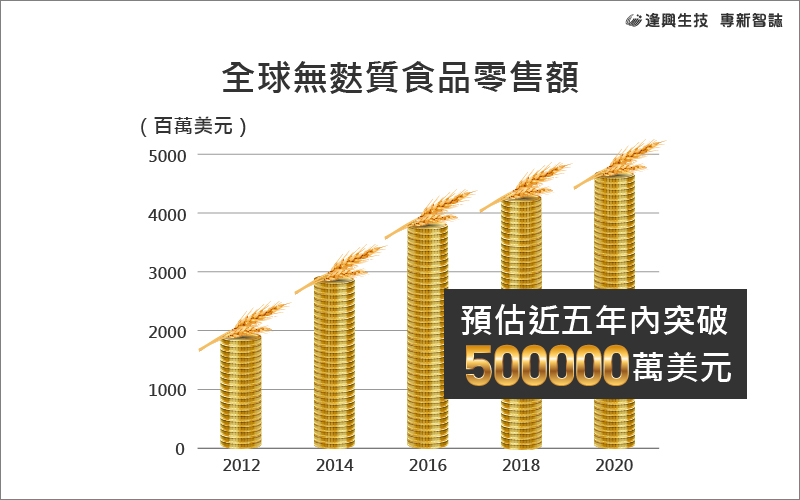 根據美國統計公司Statista報告:以零售額來看2012年無麩質食品市場規模約19.5億美元,到2017年已倍數長近一倍達38.4億美元,預估到2020年市場規模將更進一步達到46.8億美元。單就美國市場來看,2012年全美無麩質食品零售市場規模約6.0億美元,到2017年則成長至近三倍達17.6億美元的市場規模,預估2020年將成長至20.4億美元。由此數據可見無麩質健康市場正在有規模地成長且具前瞻性。