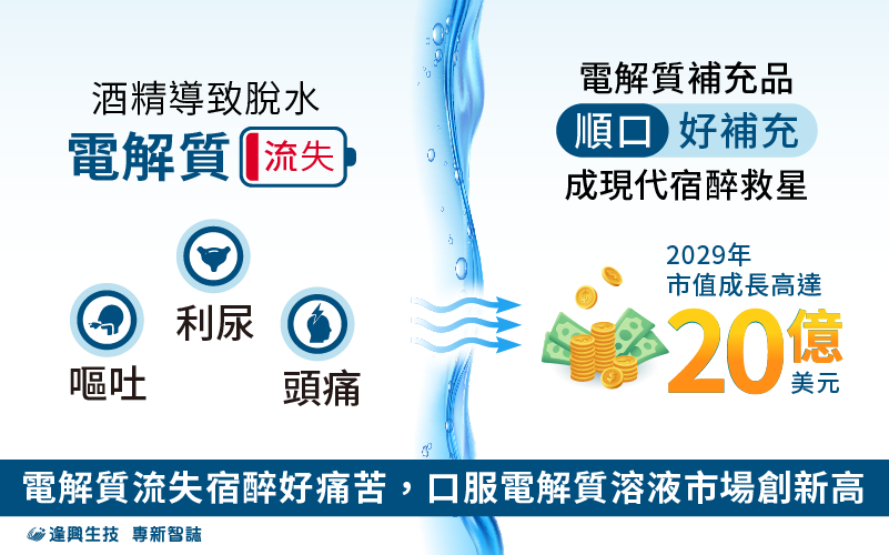 一般在運動後出汗、中暑、生病腹瀉等情況下都會失去水分[4],不過現今白領等族群容易長時間久坐未飲水,出現身體缺水的症狀,嚴重時甚至會有「經濟艙症候群[5]」,感到雙腳腫脹、頭暈、呼吸不順等,飲酒則是另一個容易被忽視的場合,酒精不但利尿且容易導致嘔吐和腹瀉,加速體內水分流失,所幸大多數脫水現象可經補水及休息得到緩解,然而一下失去大量體液,電解質(如鈉、鉀)也會隨之流失,若只補充純水,反而可能造成頭暈、身體虛弱等「低血鈉」症狀,加劇宿醉的不適,此時電解質補充品就顯得尤為重要。以往大多出現在運動場合的電解質補充,隨著聚會飲酒風氣盛行,也開始應用在應酬桌上,人們積極尋求緩解宿醉不適的方法,電解質補充液市場因此迎來創新高點,預計到2029年,該市場將達到20億美元[6]的驚人規模。