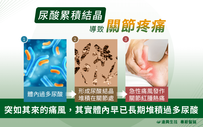 痛風在古代此病好發於常酒池肉林、大啖美食的貴族身上,因此稱之為「帝王病」。痛風是因為血中尿酸濃度過高,引起過多的尿酸結晶堆積在關節,導致關節急性發炎反應[1],會出現很明顯的紅腫、發熱、疼痛的現象,甚至用手輕輕觸碰到、被風吹過皮膚,關節也會痛得難以忍受。急性痛風發作的誘因通常是大量飲酒、吃紅肉、海鮮或與體重增加有關。現在痛風已經不再是有錢人的專利,高危險族群還包括男性、高齡、肥胖、家族病史、糖尿病患者、代謝疾病患者[2],甚至年輕族群愛吃火鍋、燒烤、消夜,飲食習慣普遍不佳,也使痛風出現在年輕人身上[3]。