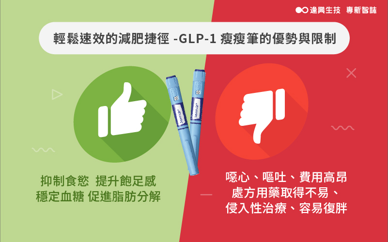 然而,天然的GLP-1在體內的壽命短暫,易被DPP-4(二肽基肽酶-4)分解,導致效果有限。瘦瘦筆通過注射GLP-1類似物直接補充,並藉助DPP-4抑制劑延長激素活性時間,使其作用更持久。GLP-1的作用機制除了注射,現在也可以透過口服的方式啟動,這讓不喜歡針劑的消費者多了一種友善選擇。相比之下,注射型瘦瘦筆仍有一些限制和副作用:
