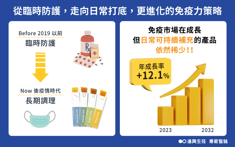 隨著長新冠後遺症、高齡化、空汙與生活節奏改變,免疫支持不再是短暫補充,而是生活中持續存在的「基本配備」。而這樣的需求,也正大幅推動全球市場成長。根據《Fortune Business Insights》調查,2023 年全球免疫學市場已達 975.8 億美元,預估至 2032 年將突破 2,573.9 億美元,年複合成長率高達 12.1%[1]。然而,消費者雖然對免疫產品的關注度提升,但能真正走進日常、讓人願意長期補充、又兼顧效果與科學基礎的選擇依然不多,這正是免疫保健市場期待被填補的一塊空白。