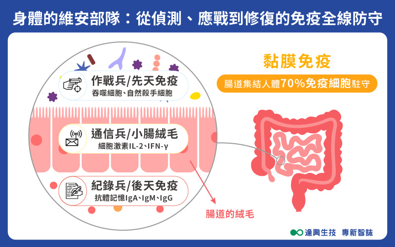 然而部隊要能啟動,還需要「訊號接收站」——也就是遍布腸道、呼吸道、泌尿道等處的黏膜免疫防線,且腸道集結了人體70%免疫細胞駐守,是重要『免疫器官』之。而這個部隊就像身體的第一線感應雷達,能攔截病毒、黏住異物、快速傳遞危機訊號,通知免疫力系統進入備戰狀態。若這層黏膜損壞、腸道環境失衡,就會像戰場基地失去聯絡,敵人入侵了,後方卻毫無反應。