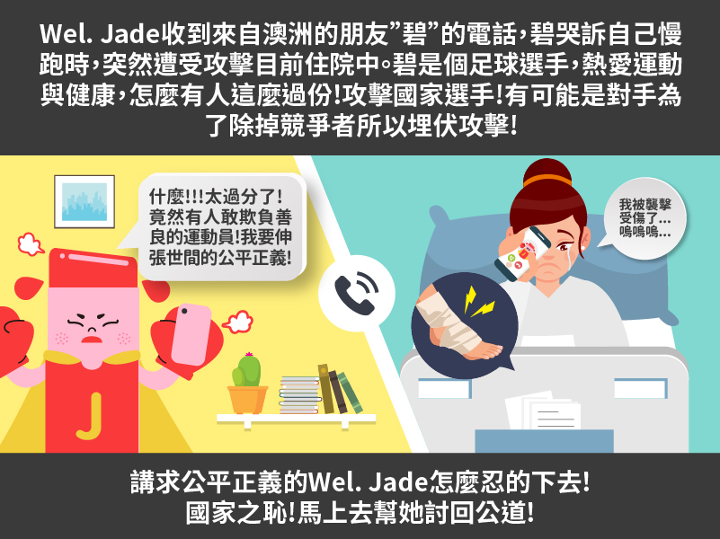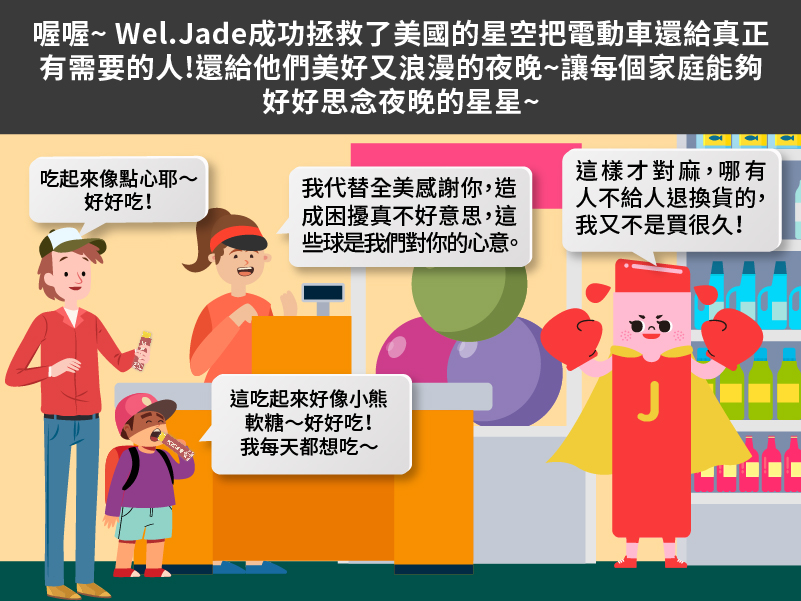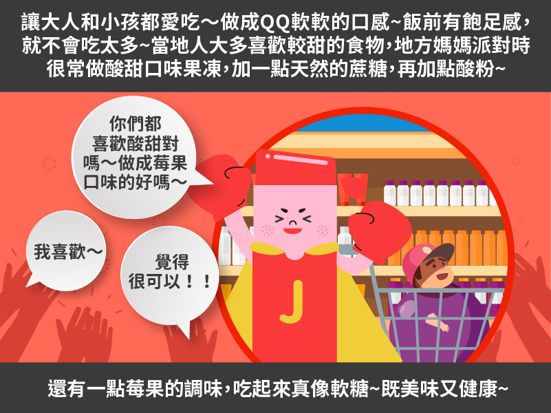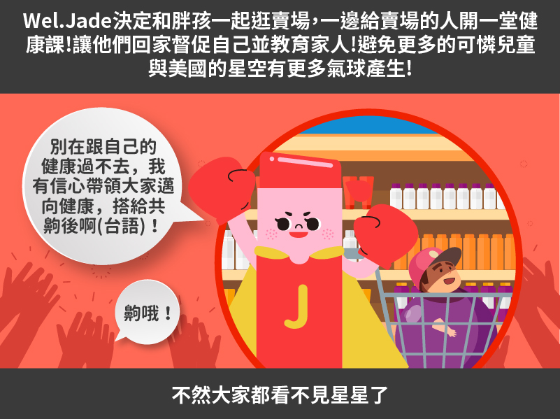 Wel.Jade她最近迷上了冰上曲棍球,特別喜歡某一個曲棍球球員,決定前往加拿大去觀賞他的球賽。到了球場的觀眾席,發現旁邊的朋友Chubby心情不好,決定上前一問。原來是因為醫生說朋友Chubby有心血管疾病,平常連走出家門都會喘,之後可能再也沒有辦法到球場看球了。為了幫助加拿大的好友Chubby, Wel.Jade此時馬上打給逢興產品經理尋求協助在加拿大這裡大家最愛喝的飲料就是薑汁汽水了,或許考慮可以把薑汁汽水做成果凍當成飲料的感覺在吃~~Chubby...
